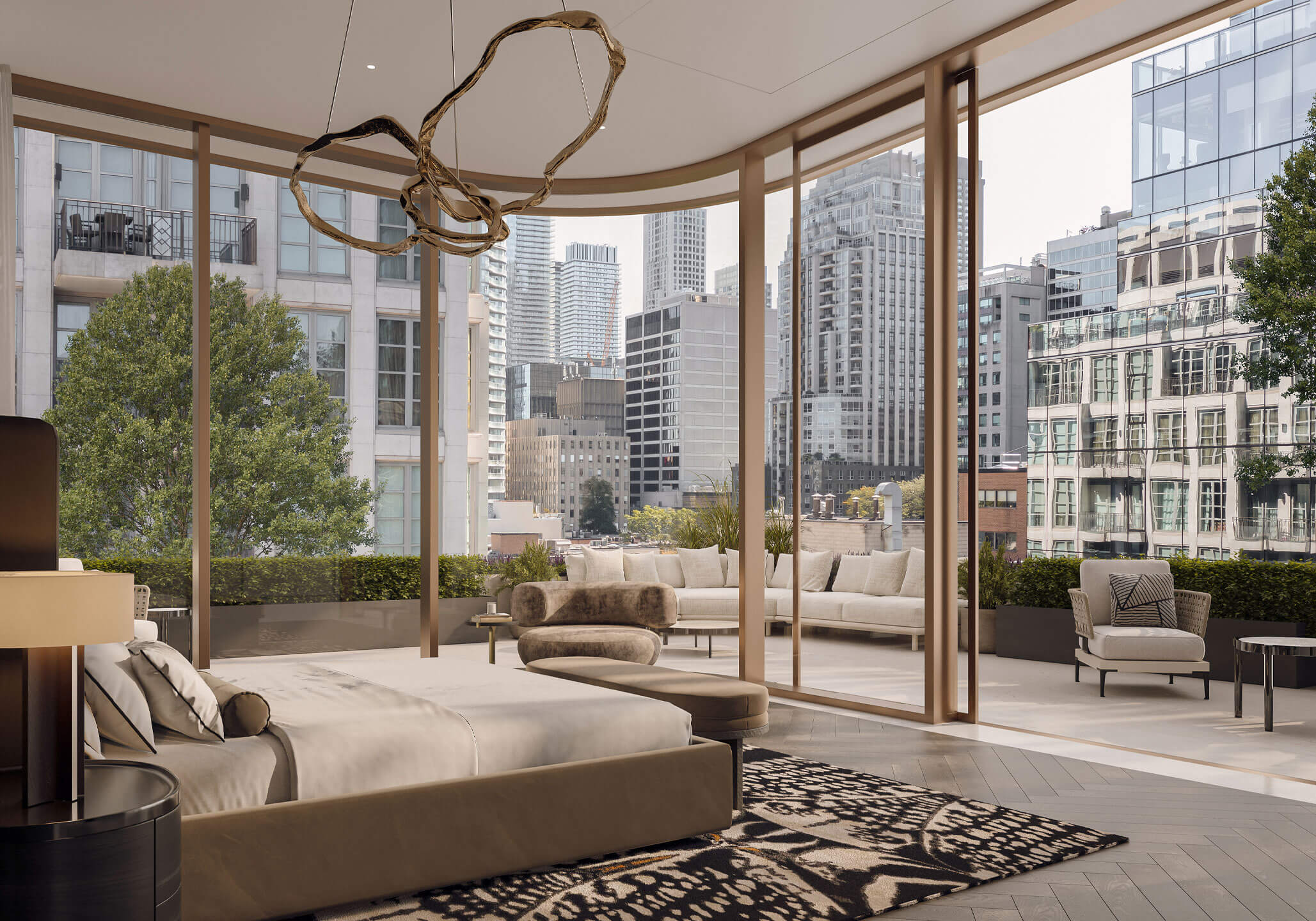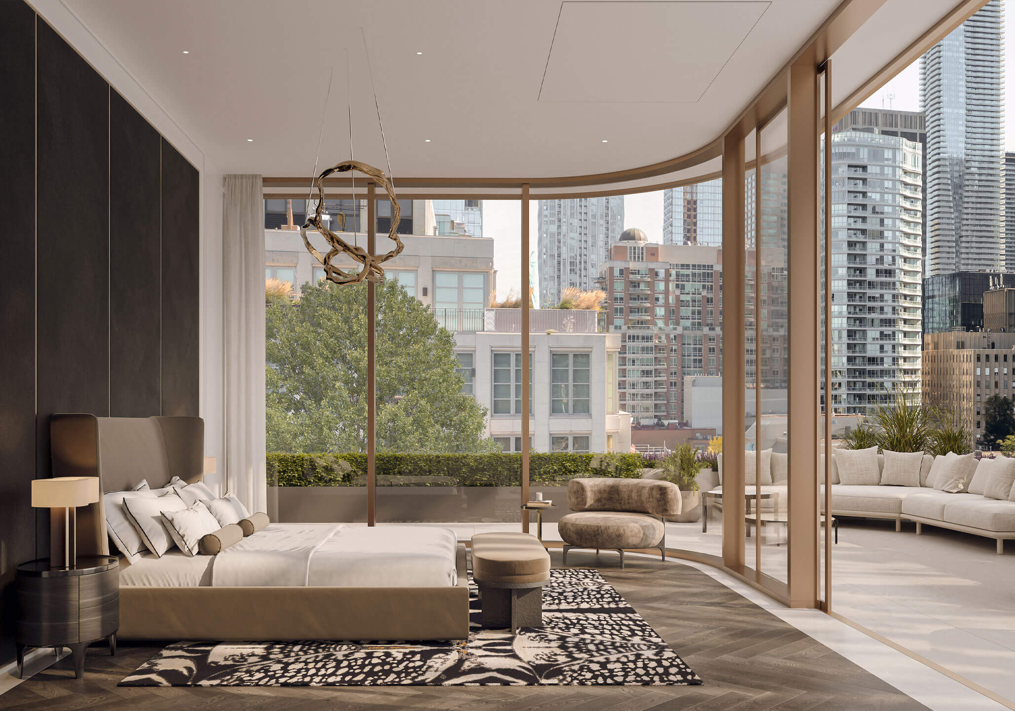 With eleven-foot floor-to-ceiling curved glass windows, the expansive primary offers full city views and a private terrace that seamlessly extends the room to the outdoors. The Traditional primary features a dark natural wide-plank wood floor and a white marble stone border.