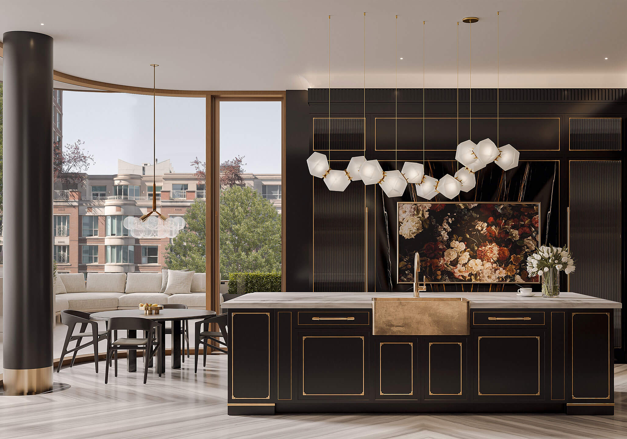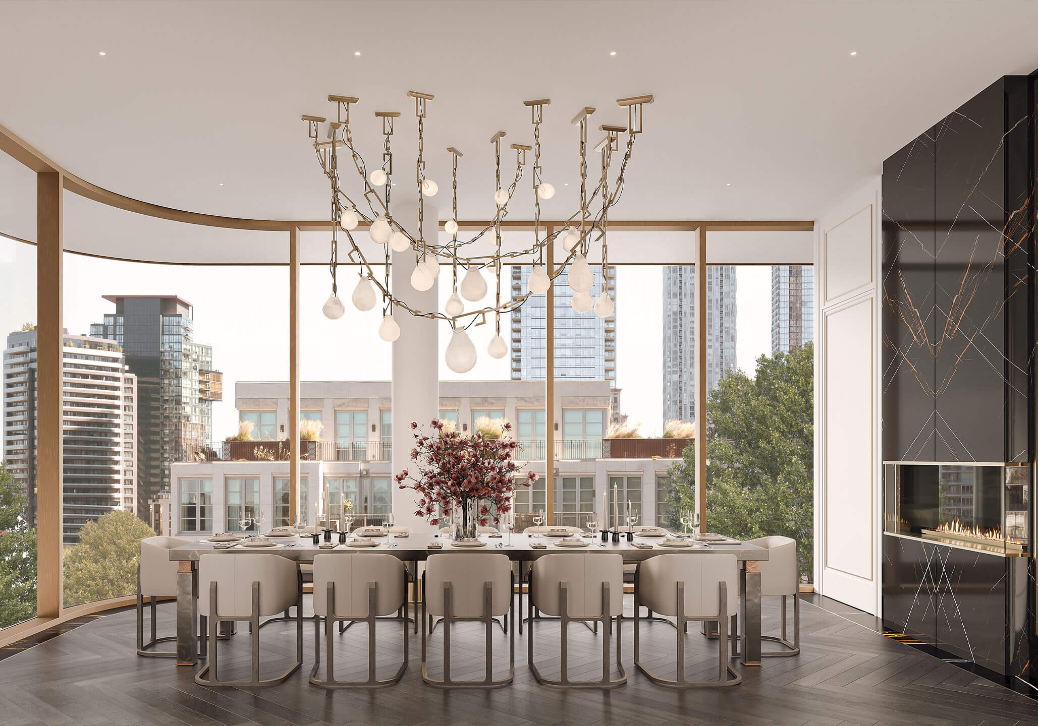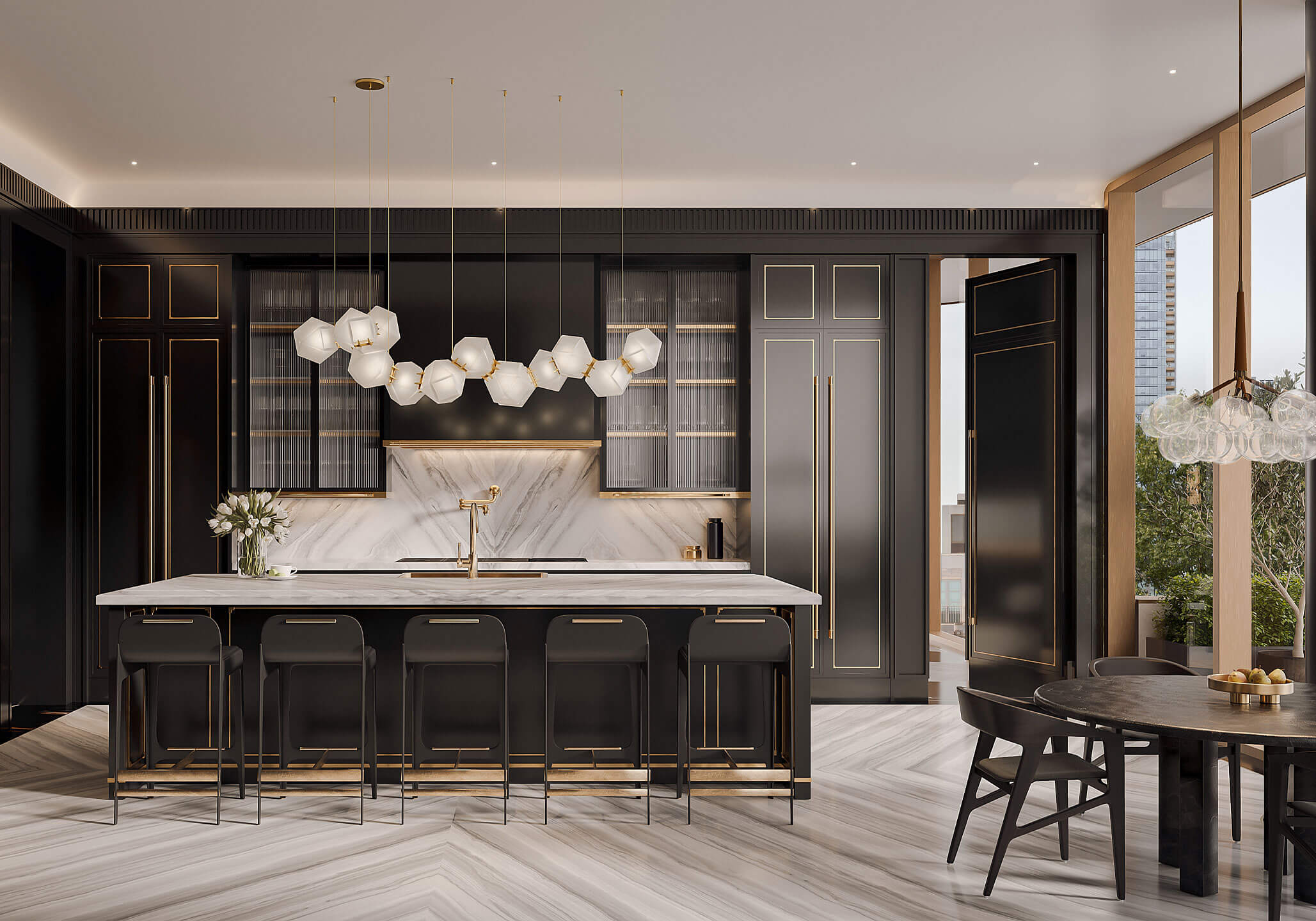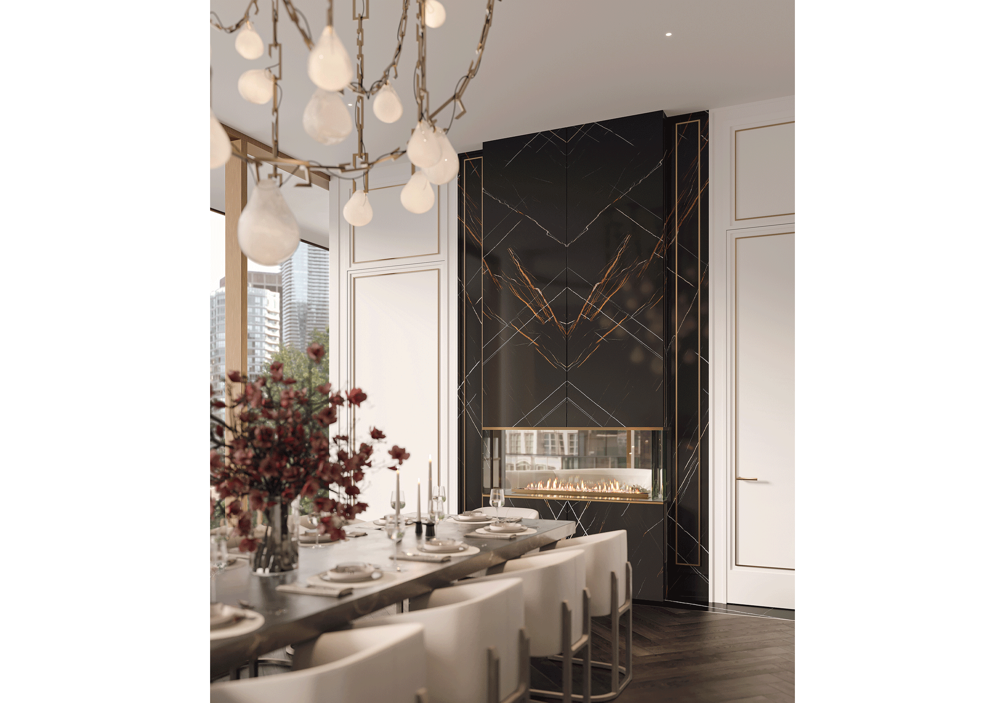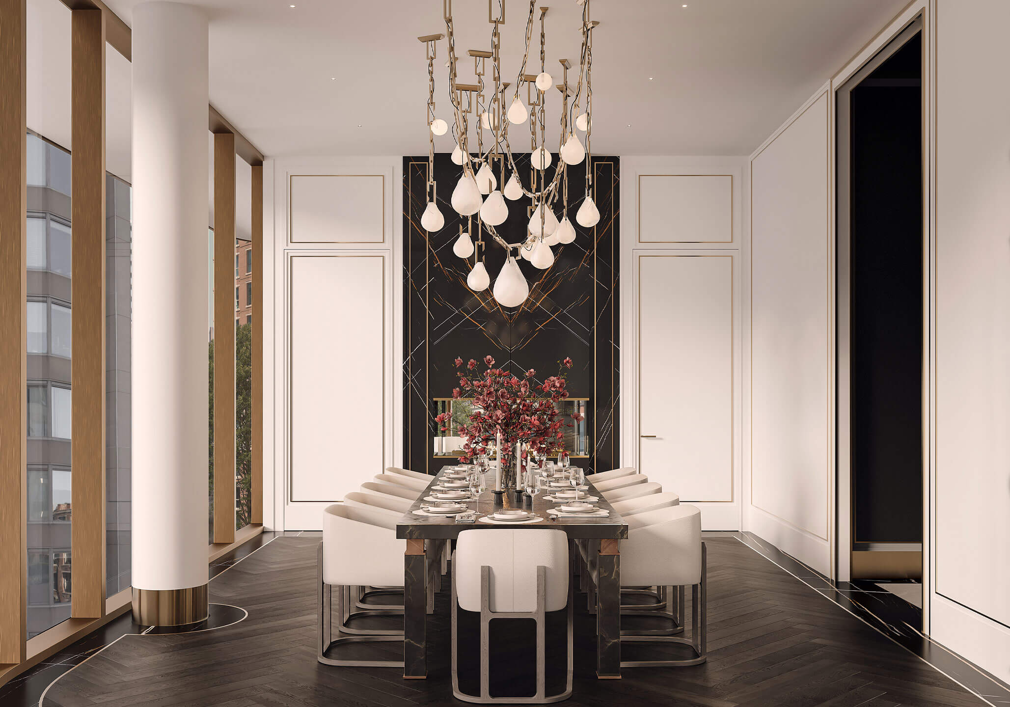 Expansive proportions reveal the generous scale of the dining space, with artisanal and sharp details that bridge classic sensibilities with modern lifestyles. The gleaming herringbone wood floors are surrounded by a black marble border, recessed baseboards, and floor-to-ceiling windows.