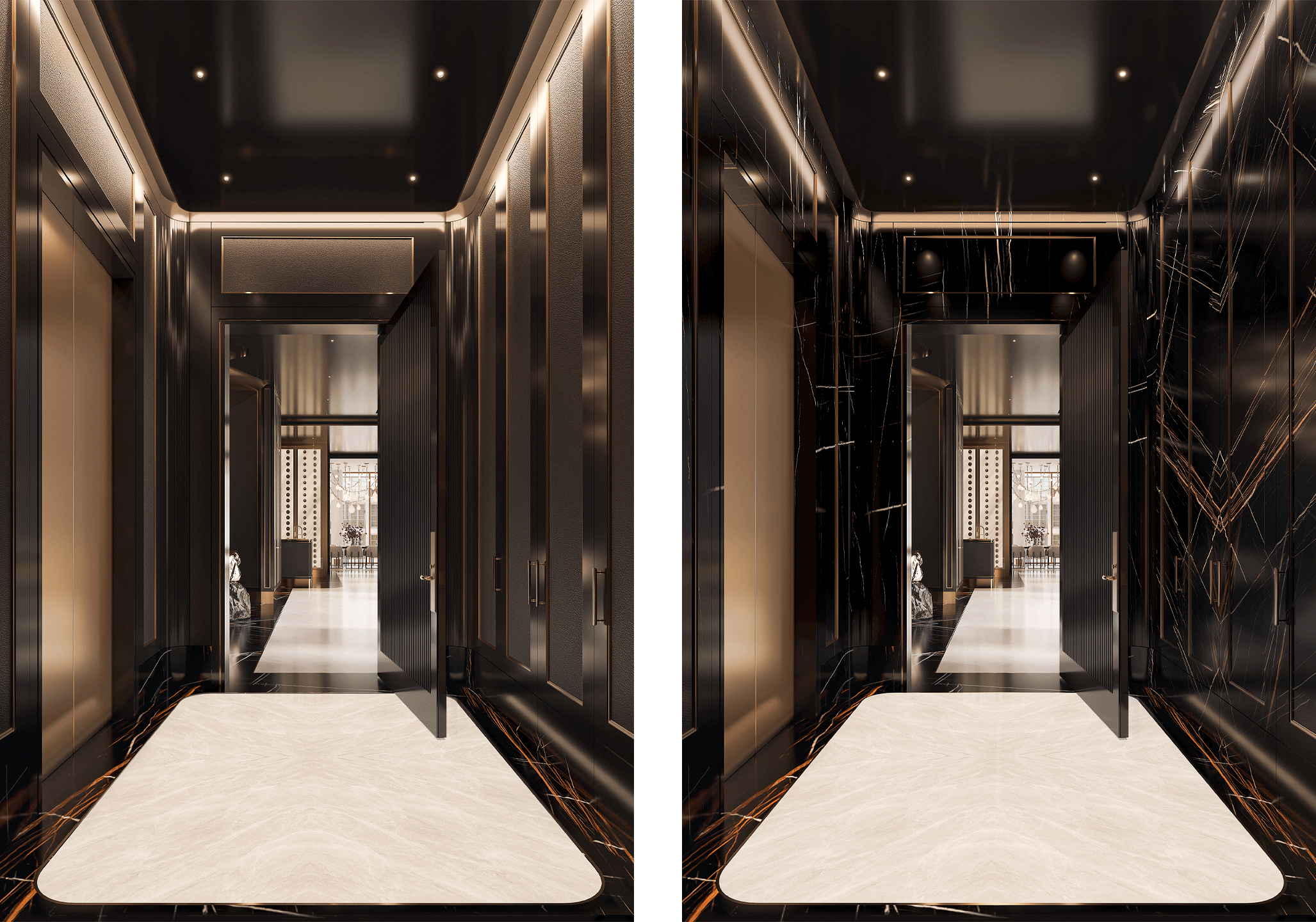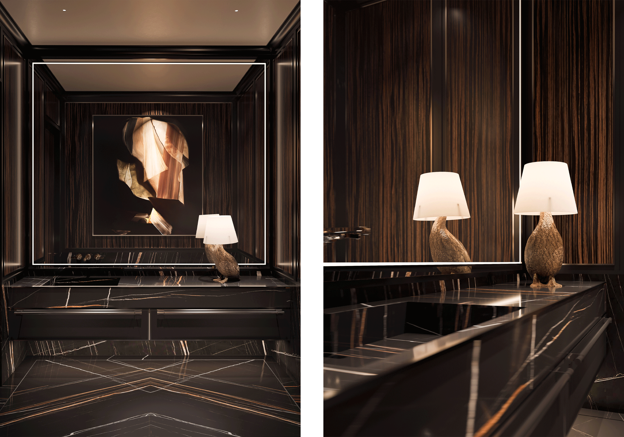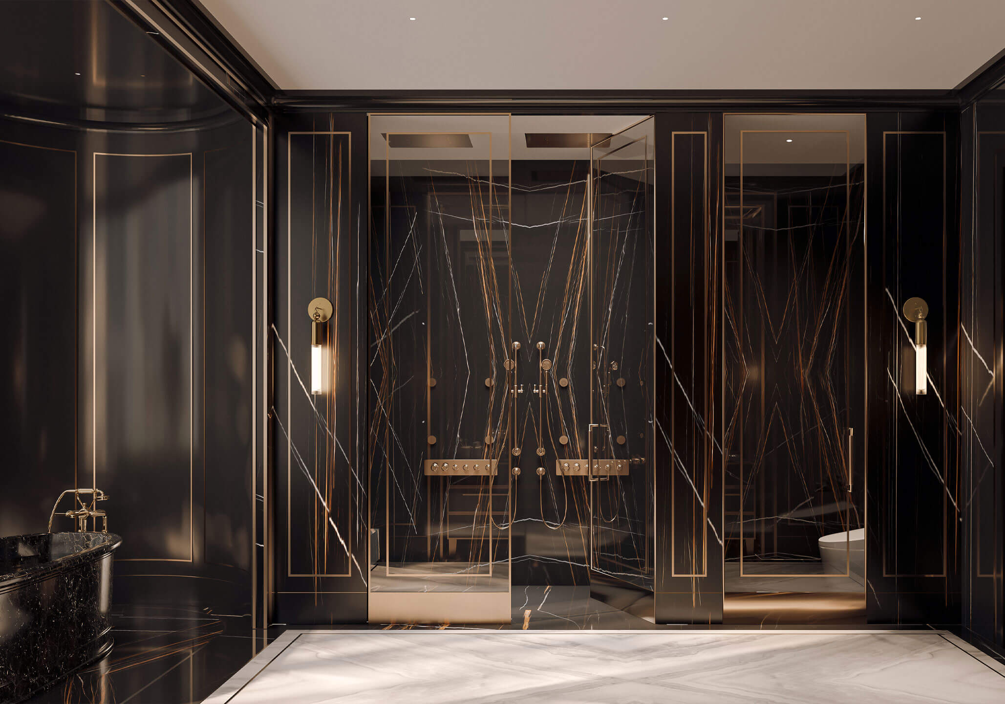 Featuring rich, textured leather and lacquered wood panelled walls with 12” Nero Tunisi marble baseboards, and a bookmatched marble floor with metal inlay detail that finish the room and set the stage for this dramatic design style.