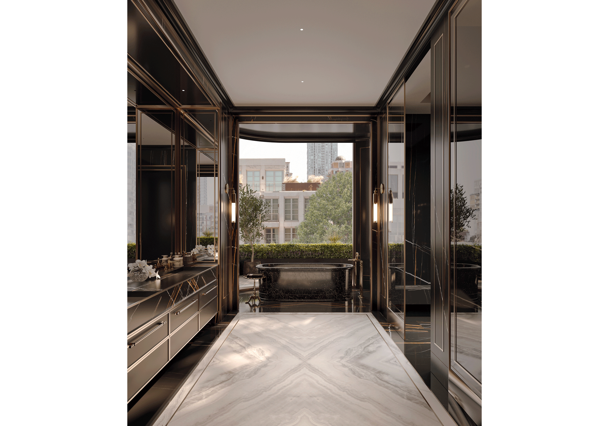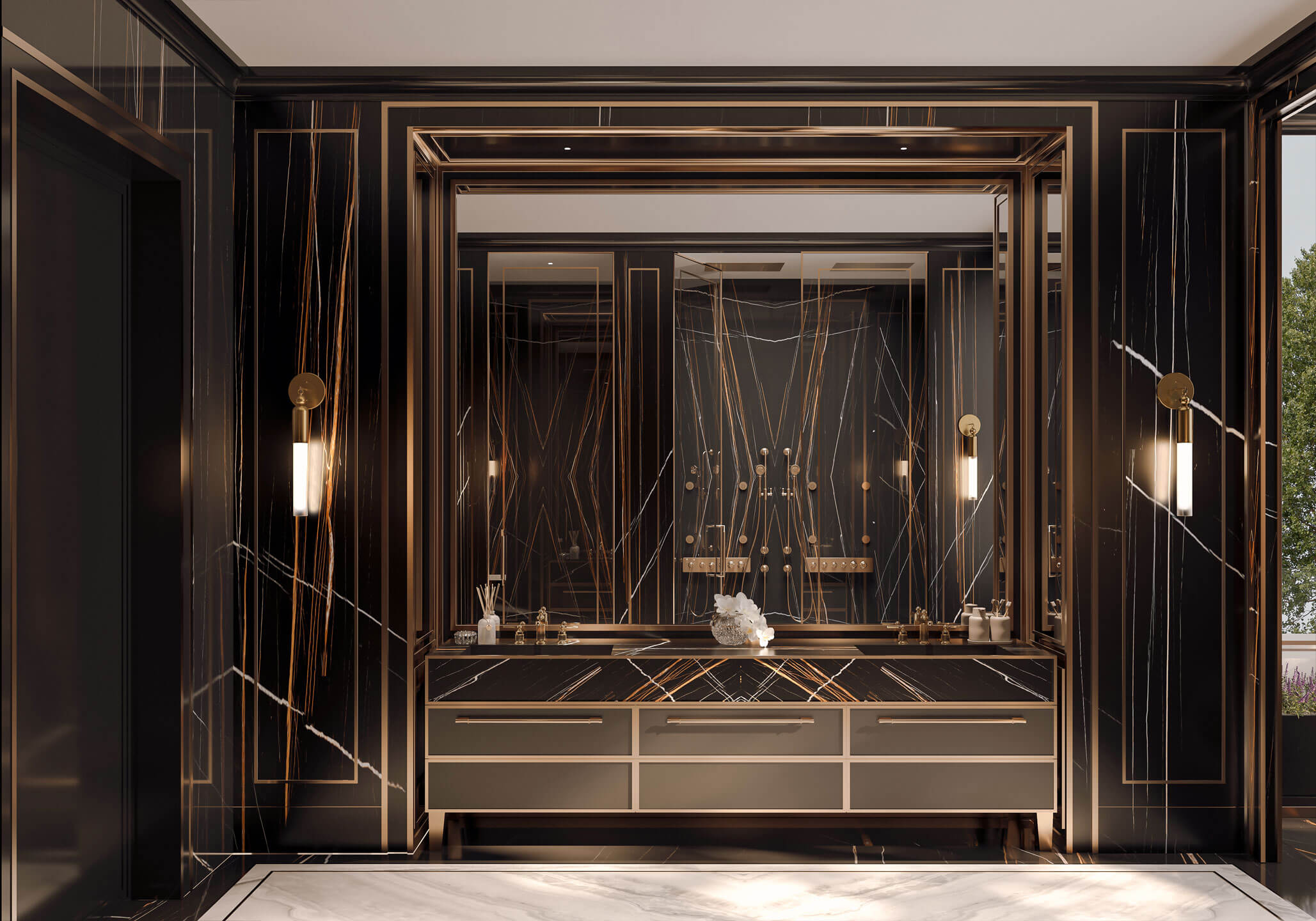 Immersive black marble slab is an invitation into a deep privacy that spans the floors and walls throughout the entire ensuite in intricate continuity. The bronze veining shines a filigree accent on the interior, illuminated further by cove lighting and natural daylight that pours in through the floor-to-ceiling windows. The expansive custom vanity, featuring integrated sinks, premium Italian designer fixtures, a vanishing mirror TV, and a modern shower complete this stunning spa-like ensuite.