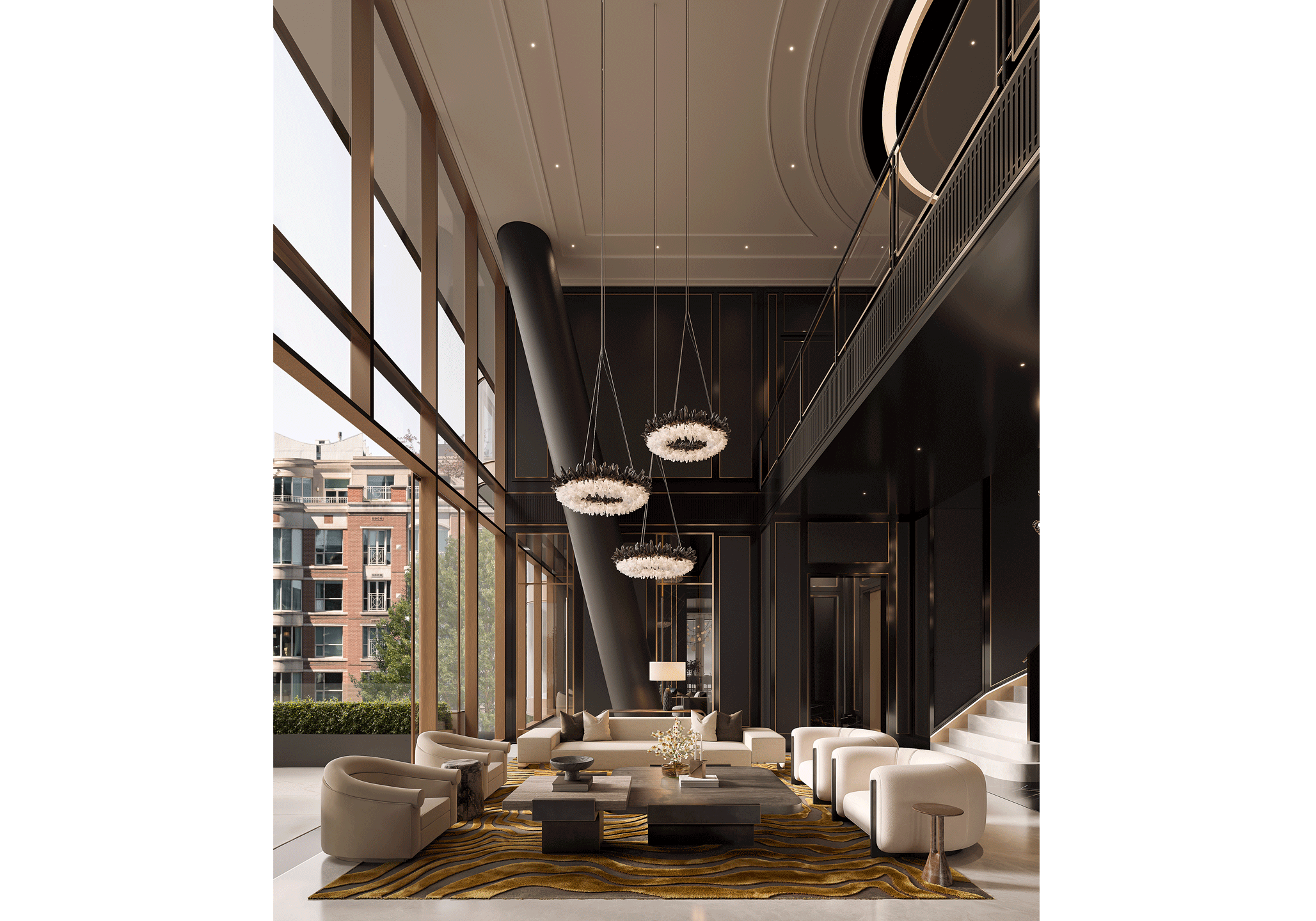 The great room permeates sky and sun through the expansive double-height floor-to-ceiling windows that surround the space. Natural light illuminates the timeless dark herringbone floors framed by a classic Nero Tunisi border. The monolithic gas fireplace stands tall clad in bookmatched Nero Tunisi marble that extends to the ceiling.