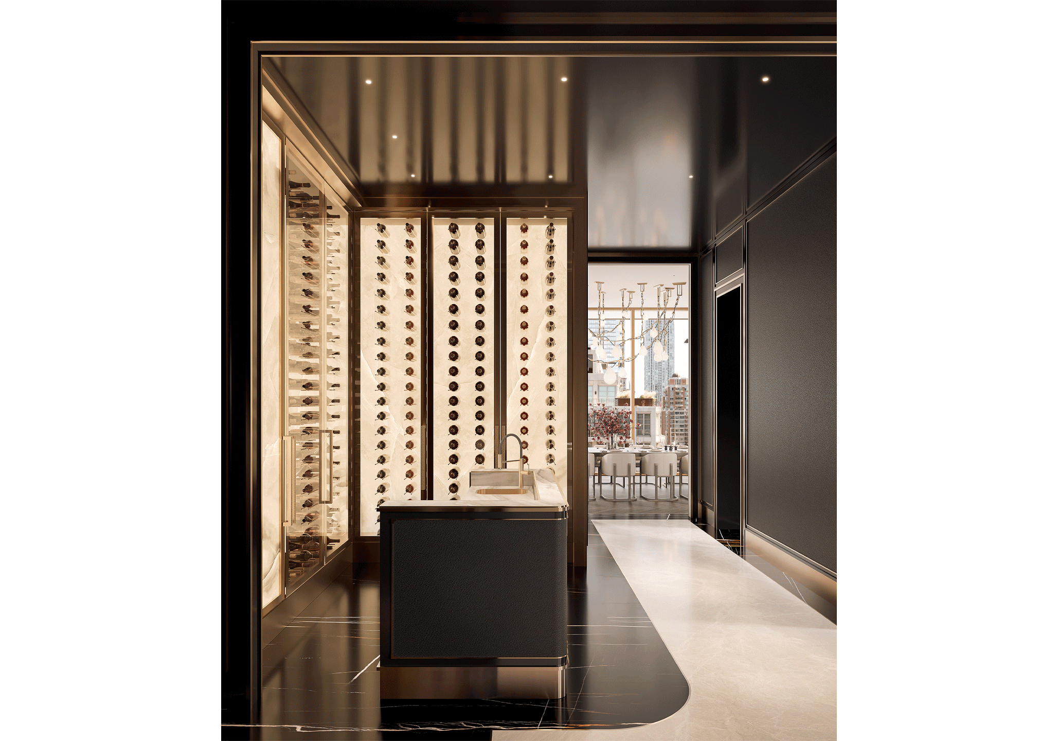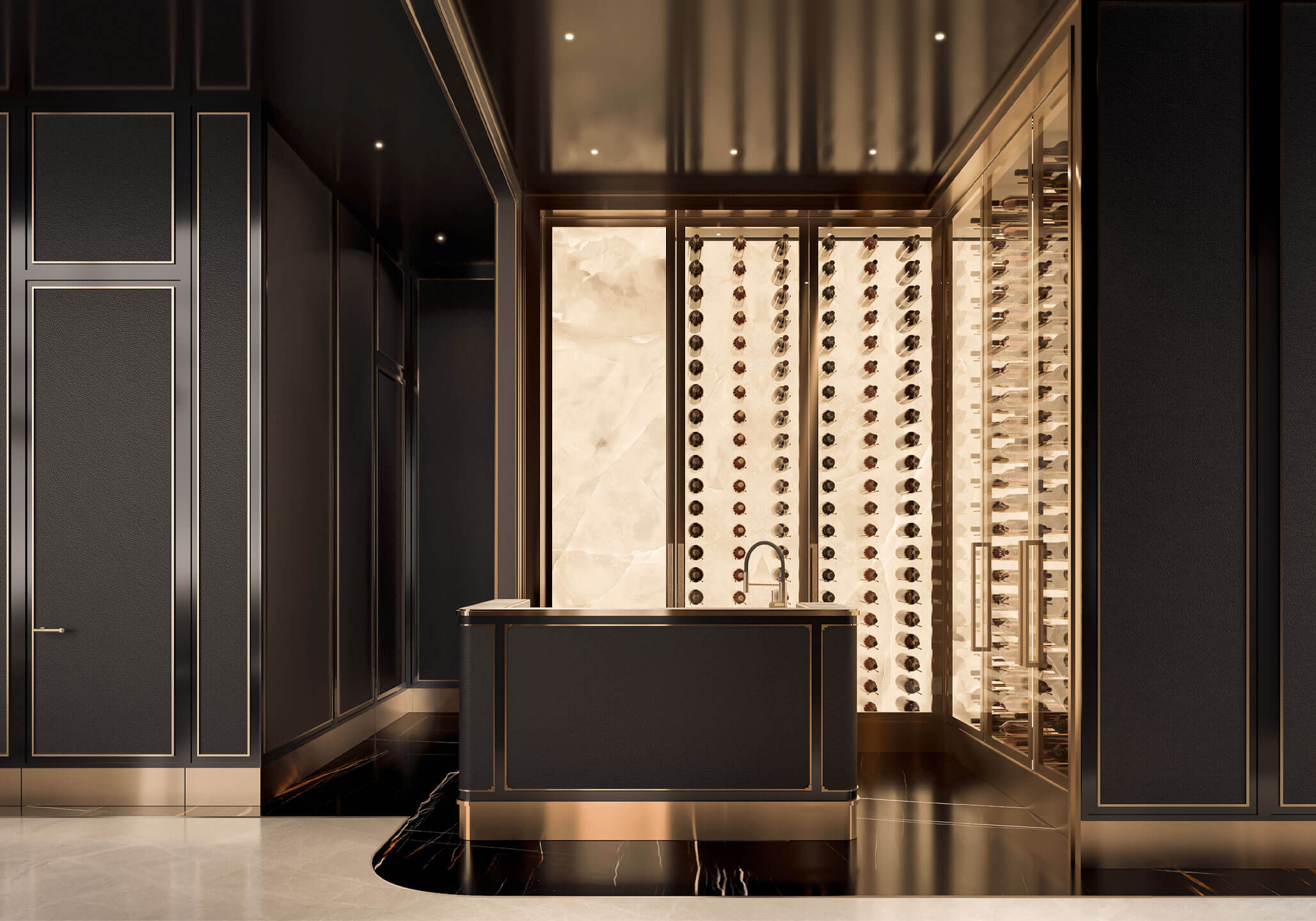 Back-lit and bookmatched marble walls highlight your custom-designed, climate-controlled wine display. This private room is defined by a marble flooring bordered by recessed metal details, fluted valence and an integrated bar with elegant accents.